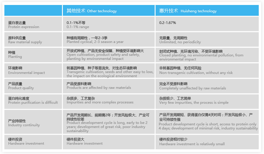 1)单株生菜蛋白生产量高:惠升专有平台技术使生菜瞬时生产外源蛋白量提高到了1.67g/kg,是目前所知瞬间生产系统最高的生产量;